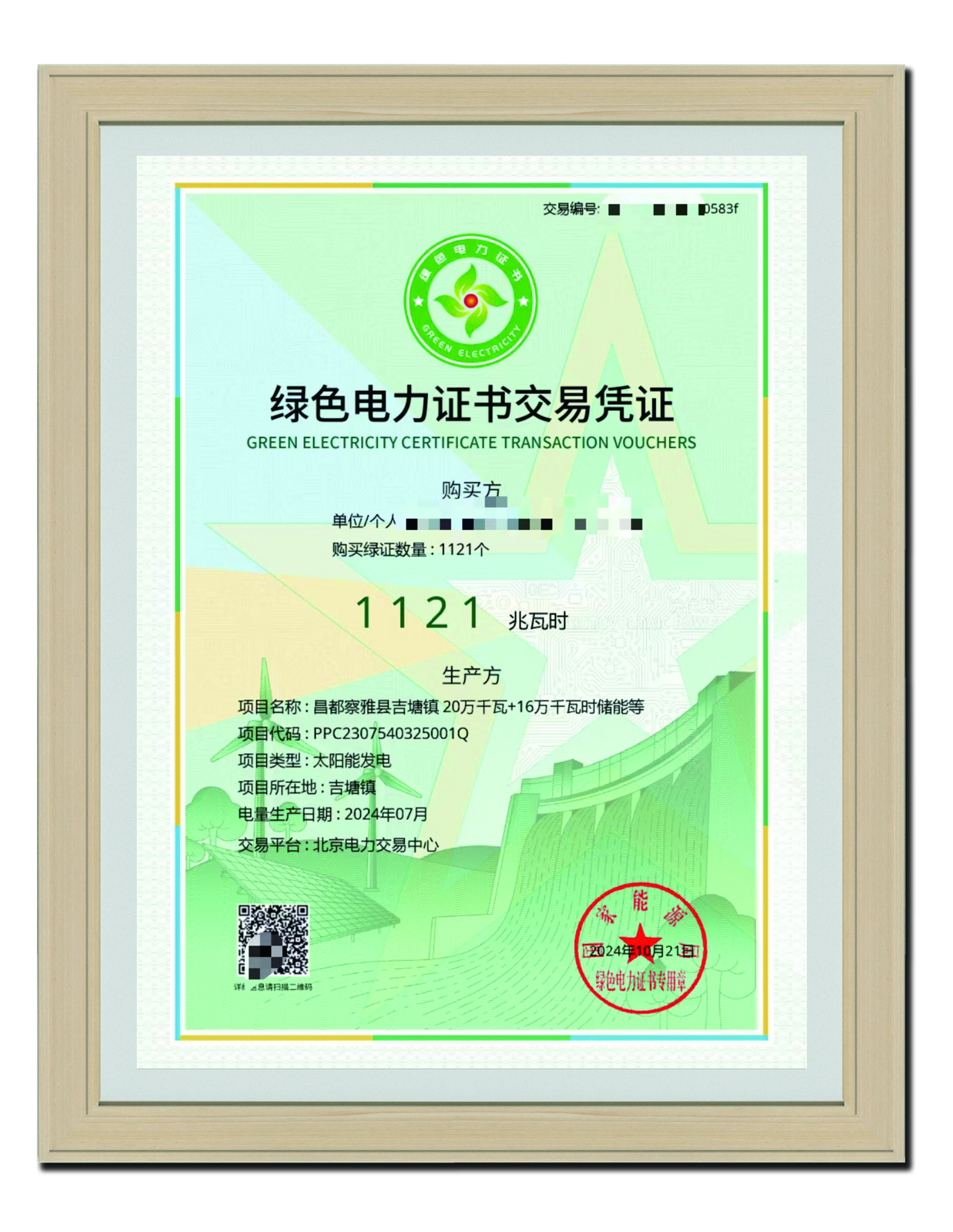 2024年10月21日 綠色電力證書交易憑證1121兆瓦時(shí)