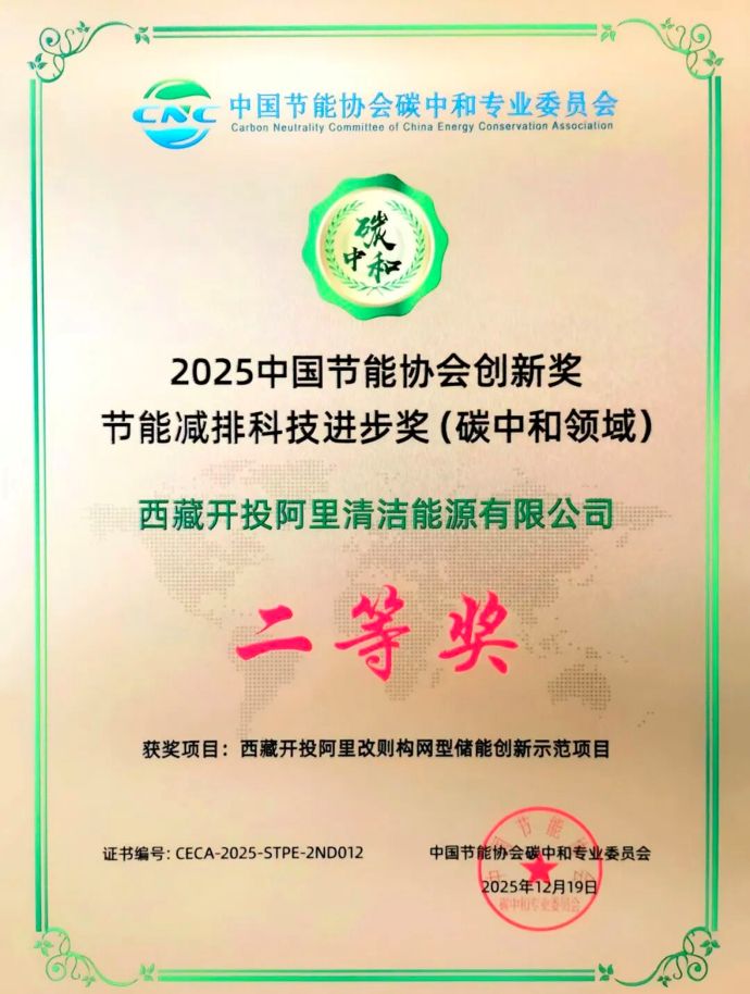 近日,由中國質(zhì)量認證中心、中國節(jié)能協(xié)會碳中和專業(yè)委員會聯(lián)合頒發(fā)的2025中國節(jié)能協(xié)會創(chuàng)新獎名單揭曉,由西藏開投阿里清潔能源公司投資建設(shè)的阿里改則構(gòu)網(wǎng)型儲能創(chuàng)新示范項目獲“節(jié)能減排科技進步獎(碳中和領(lǐng)域)二等獎”。