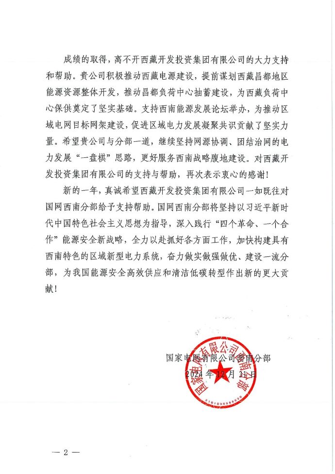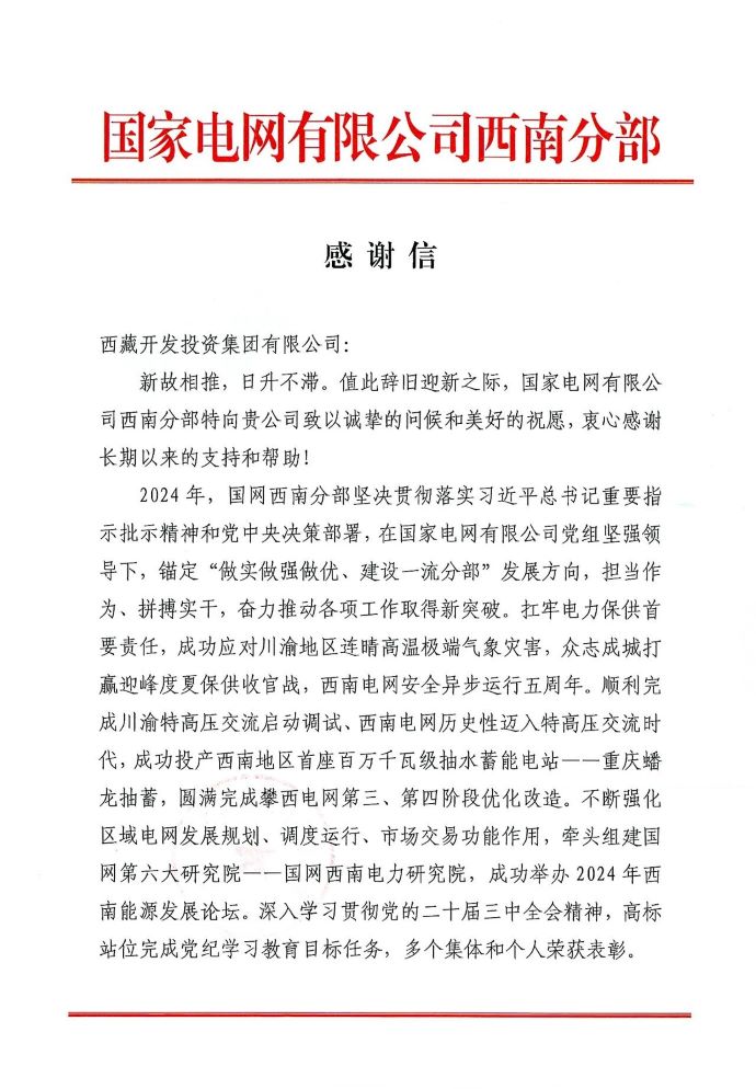 新年伊始,西藏開投集團(tuán)收到來自國網(wǎng)電力有限公司西南分部的一封感謝信,對(duì)集團(tuán)積極推動(dòng)西藏電源建設(shè),提前謀劃西藏昌都地區(qū)能源資源整體開發(fā),推動(dòng)昌都負(fù)荷中心抽蓄建設(shè),以及支持西南能源發(fā)展論壇舉辦,推動(dòng)區(qū)域電網(wǎng)目標(biāo)網(wǎng)架建設(shè),促進(jìn)區(qū)域電力發(fā)展凝聚共識(shí)作出的貢獻(xiàn)表示感謝。