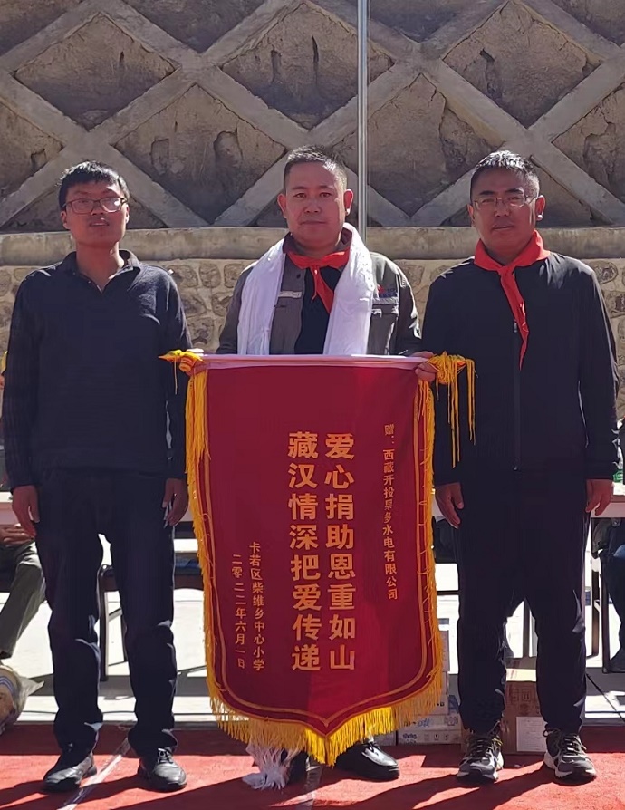 果多水電公司代表張二林同志作了題為“祖國的未來,民族的希望”的講話,并代表果多水電公司給學(xué)校捐贈了學(xué)習(xí)用品,足球、排球、羽毛球等,勉勵孩子們要樹立遠大理想,努力學(xué)習(xí),健康成長,以優(yōu)異的成績回報社會、回報祖國。柴維鄉(xiāng)小學(xué)贈送了“愛心捐助恩重如山,藏漢情深把愛傳遞”的錦旗,感謝果多水電公司對學(xué)校的關(guān)心支持幫助。