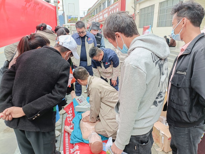 為保證活動實效,嘎堆水電公司提前籌劃、精心準備了形式多樣的活動素材,現(xiàn)場不僅懸掛了“實施安全生產(chǎn)法 人人事事保安全”的宣傳標語,還設(shè)置了咨詢臺、安全展板等,志愿者們向現(xiàn)場群眾講解并發(fā)放了《安全生產(chǎn)月宣傳雨傘、文化帽》《安全知識進萬家系列—急救知識宣傳冊》等四類共計150份安全生產(chǎn)政策法規(guī)、應(yīng)急避險和自救互救方法等方面的宣傳資料。在實操展示環(huán)節(jié),志愿者用心肺復蘇模擬器和觸電感受器向現(xiàn)場群眾講解并演示了急救知識—心肺復蘇操作方法和體驗人體觸電的真實感受。