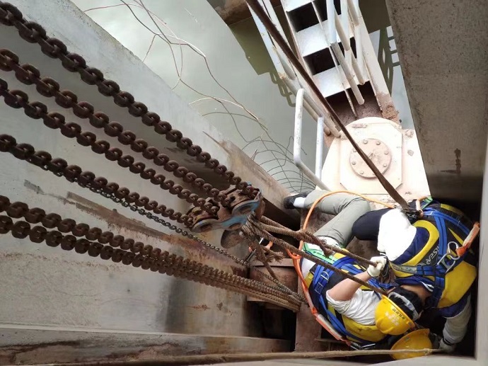 9月5日11時(shí)30分,果多水電站上游來水量突增,水庫攔污漂變浮箱無法及時(shí)上浮,導(dǎo)致大量垃圾飄進(jìn)進(jìn)水口區(qū)域,給機(jī)組運(yùn)行造成一定的安全隱患。吉克爾博接到部門安排后,馬上帶領(lǐng)兩名青年員工到浮箱上利用千斤頂、手動(dòng)葫蘆等工具開展處理。經(jīng)過分析、討論,判定攔污漂卡澀的原因?yàn)閷?dǎo)向輪長(zhǎng)期受力不均發(fā)生變形,利用千斤頂反向作用力和手拉葫蘆的牽引力,最終將攔污漂卡澀問題解決。