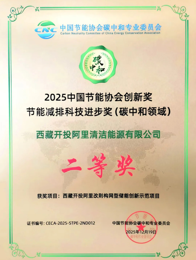 近日,由中國質量認證中心、中國節(jié)能協(xié)會碳中和專業(yè)委員會聯(lián)合頒發(fā)的2025中國節(jié)能協(xié)會創(chuàng)新獎名單揭曉,由西藏開投阿里清潔能源公司投資建設的阿里改則構網型儲能創(chuàng)新示范項目獲“節(jié)能減排科技進步獎(碳中和領域)二等獎”。