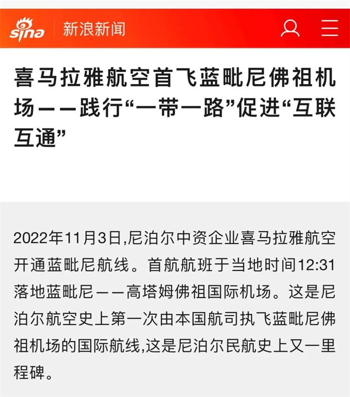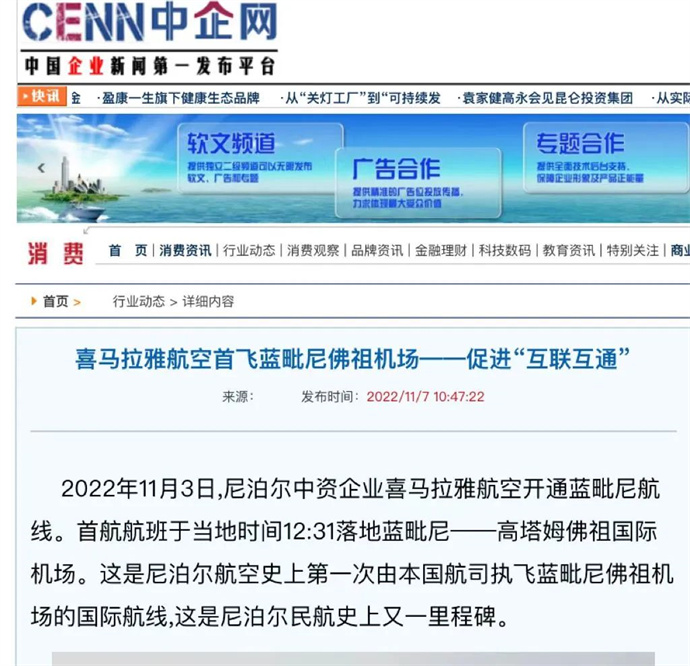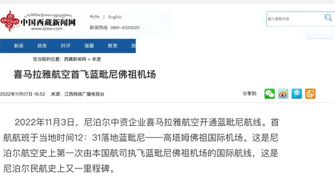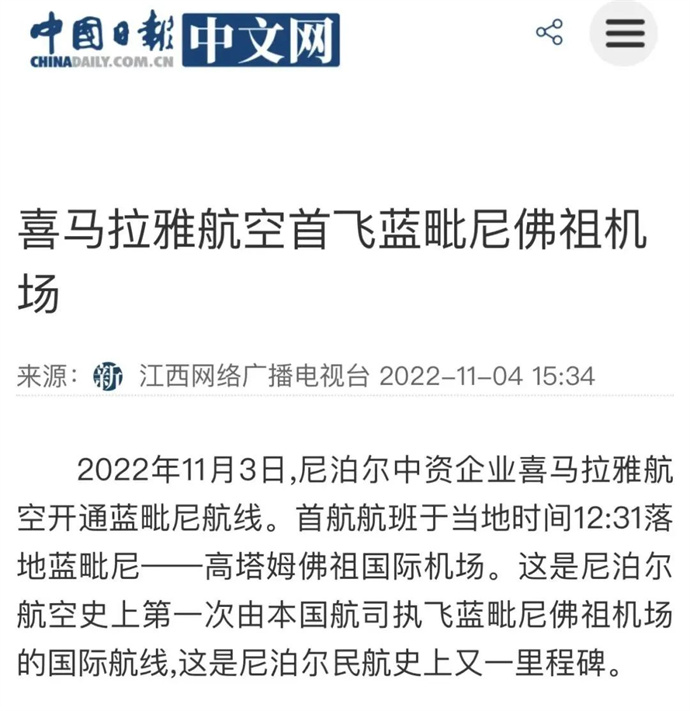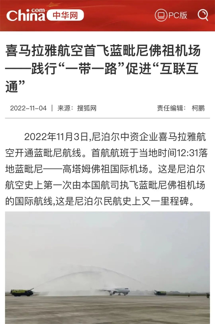 中華網(wǎng)、中國網(wǎng)、中企網(wǎng)、中國日報、光明日報、中國旅游新聞網(wǎng)、中國西藏新聞網(wǎng)、拉薩新聞網(wǎng)等媒體報道喜航開通加德滿都至藍毗尼航線