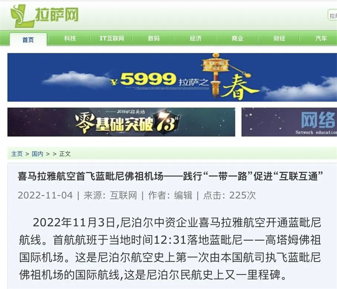 ?。ň幷甙矗?2022年11月4日至9日,中華網(wǎng)、中國網(wǎng)、中企網(wǎng)、中青網(wǎng)、中國日報網(wǎng)、光明日報、騰訊網(wǎng)、新浪網(wǎng)、搜狐網(wǎng)、今日頭條、中國旅游新聞網(wǎng)、中國西藏新聞網(wǎng)、拉薩新聞網(wǎng)、西藏生活網(wǎng)、西藏視窗、每日經(jīng)濟西藏、西藏途游網(wǎng)等媒體報道了《喜馬拉雅航空首飛藍毗尼佛祖機場》文章。摘要如下: