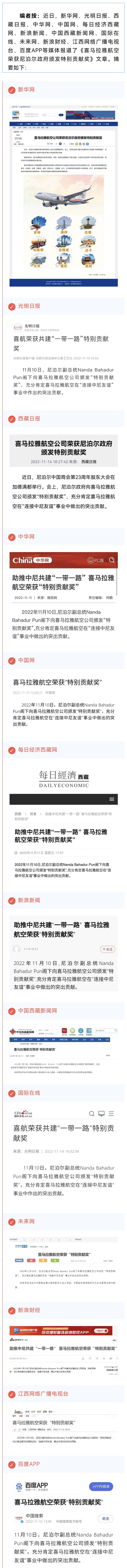 新華網(wǎng)、光明日報(bào)、西藏日報(bào)、新浪新聞、中國西藏新聞網(wǎng)等13家媒體報(bào)道喜馬拉雅航空榮獲尼泊爾政府頒發(fā)特別貢獻(xiàn)獎(jiǎng)