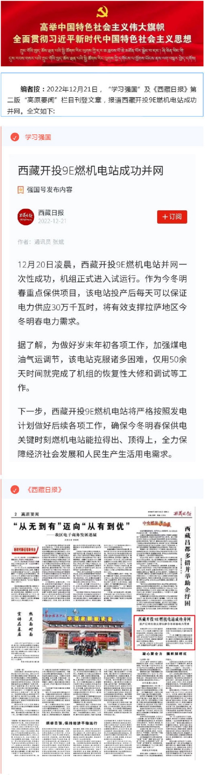 “學習強國”、《西藏日報》報道西藏開投9E燃機電站成功并網(wǎng)