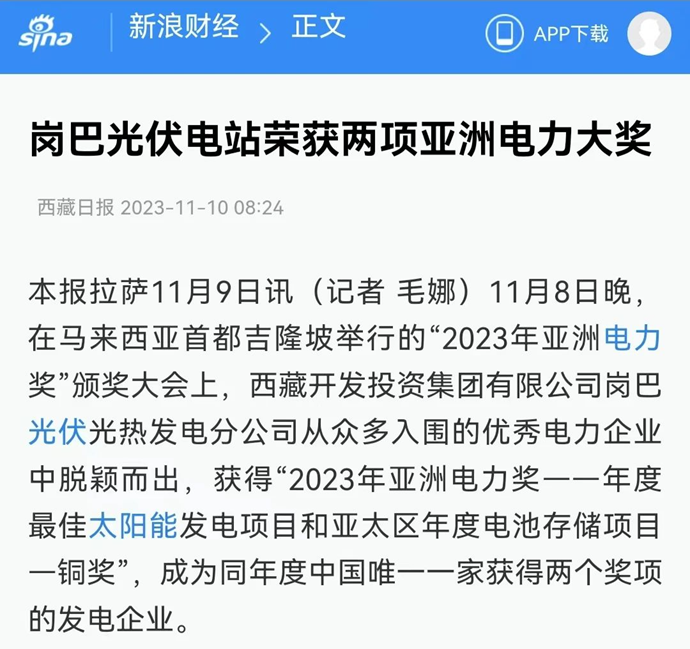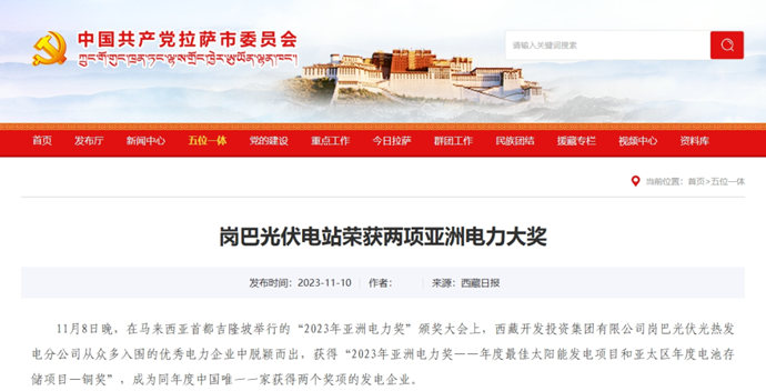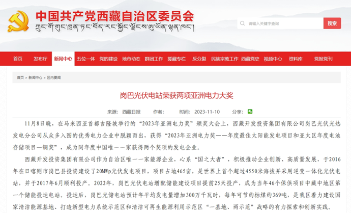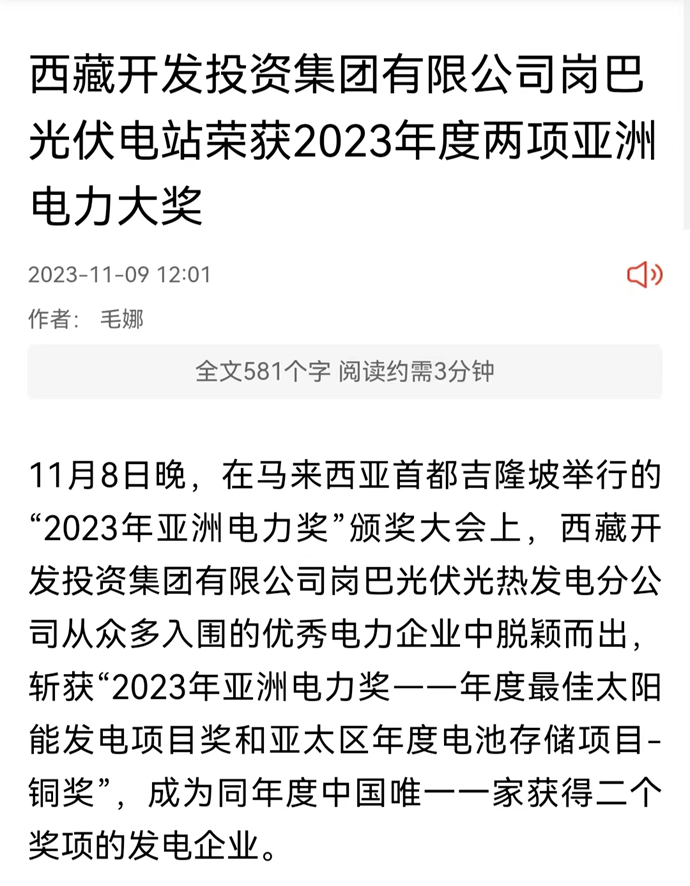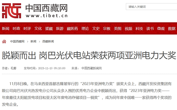 科技日報、西藏日報、西藏日報客戶端等多個媒體報道了《西藏開發(fā)投資集團(tuán)有限公司崗巴光伏電站榮獲2023年度兩項亞洲電力大獎》
