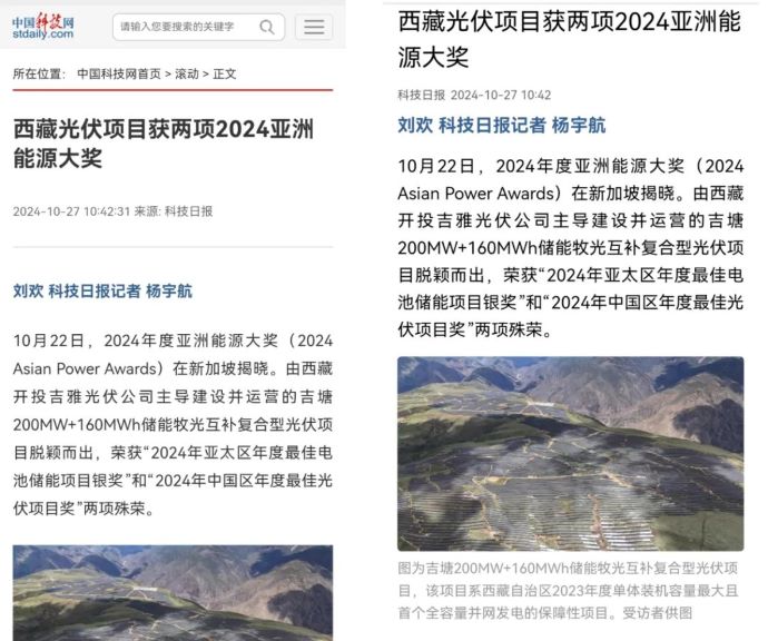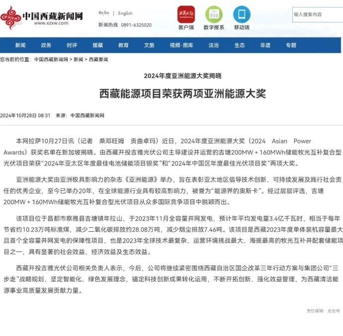 編者按:近日,中國科技網(wǎng)、科技日報(bào)、西藏日報(bào)、西藏發(fā)布、中國西藏新聞網(wǎng)、西藏商報(bào)、昌都發(fā)布等多家媒體集中宣傳報(bào)道了西藏開投吉雅光伏公司榮獲兩項(xiàng)亞洲能源大獎相關(guān)事宜。摘要如下: