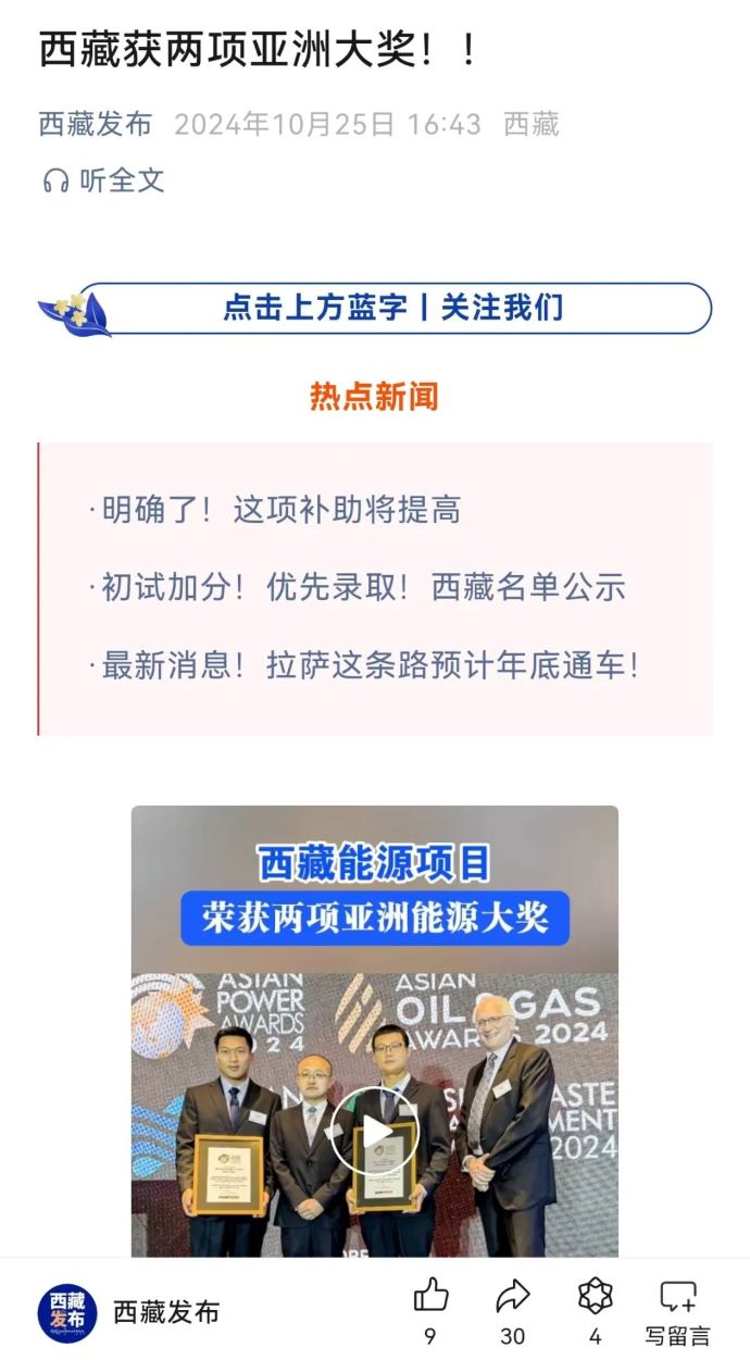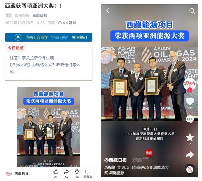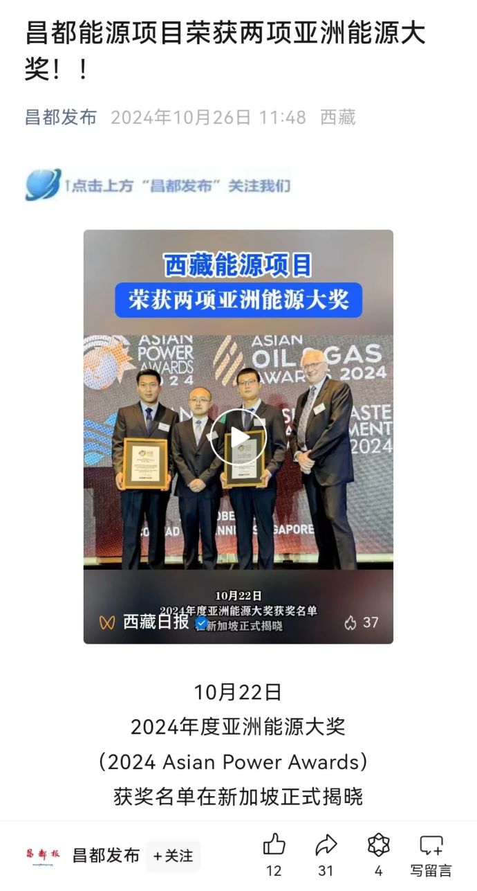 媒體報(bào)道丨西藏能源項(xiàng)目榮獲兩項(xiàng)亞洲能源大獎