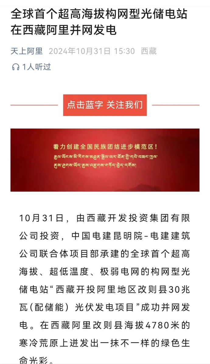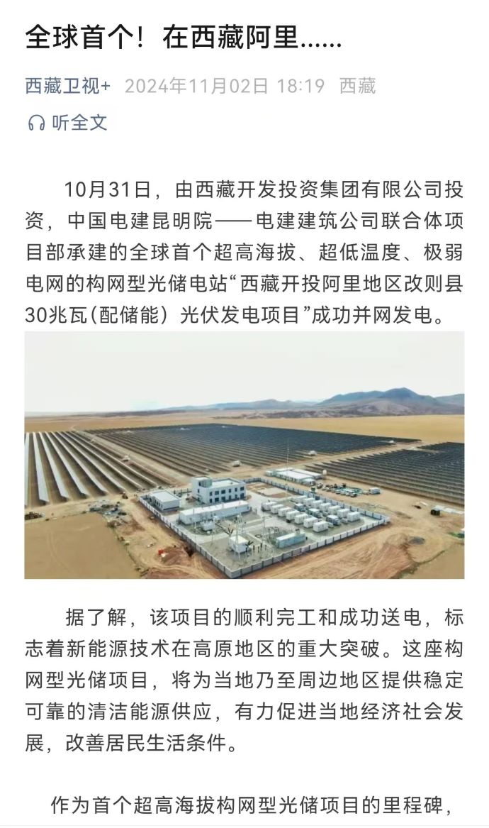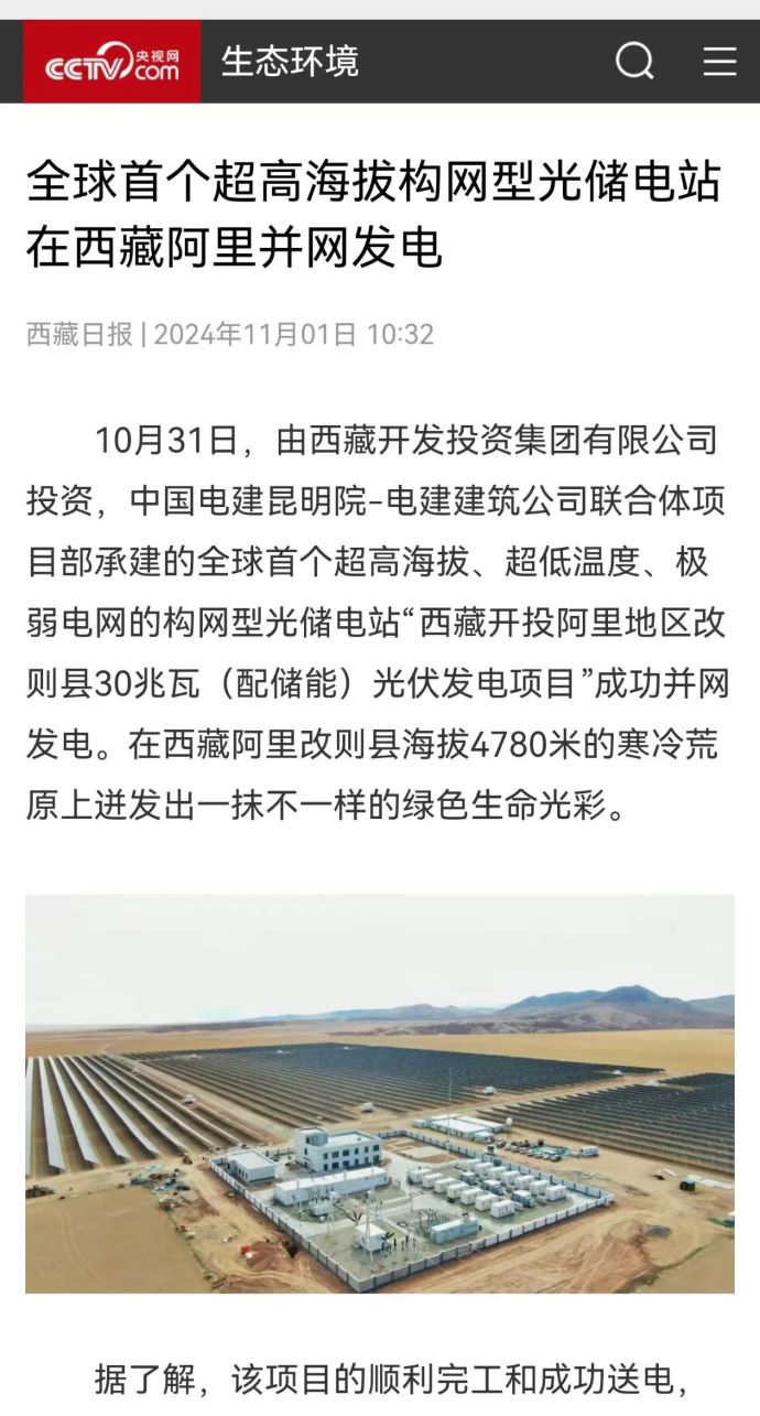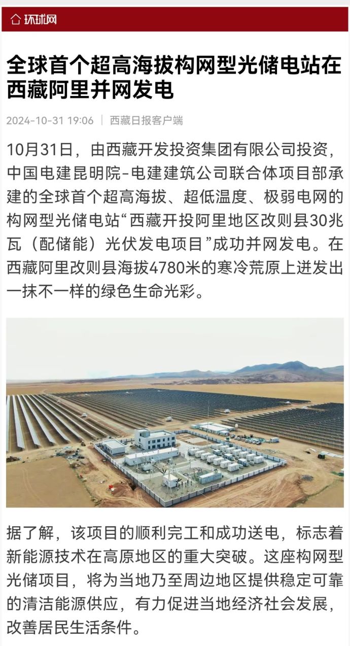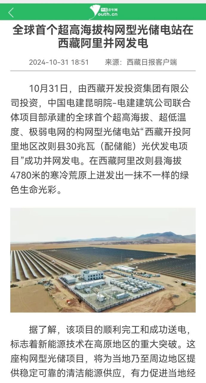 10月31日,由西藏開(kāi)投集團(tuán)投資、中國(guó)電建昆明院-電建建筑公司聯(lián)合體項(xiàng)目部承建的,全球首個(gè)超高海拔、超低溫度、極弱電網(wǎng)智能組串式構(gòu)網(wǎng)型光儲(chǔ)電站——西藏開(kāi)投阿里地區(qū)改則縣30兆瓦(配儲(chǔ)能)光伏發(fā)電項(xiàng)目,成功并網(wǎng)發(fā)電,標(biāo)志著新能源技術(shù)在高原地區(qū)的重大突破。