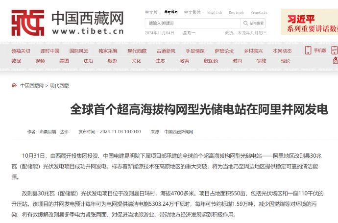 媒體報(bào)道丨全球首個(gè)超高海拔構(gòu)網(wǎng)型光儲(chǔ)電站在西藏阿里并網(wǎng)發(fā)電