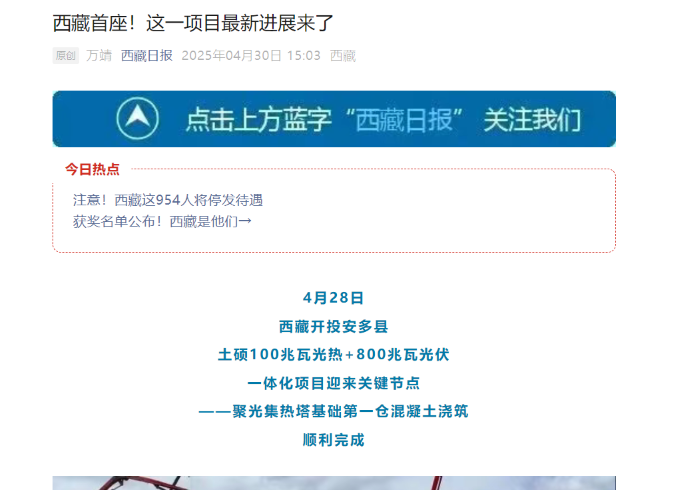 媒體報(bào)道丨西藏首個(gè)光熱示范工程迎來關(guān)鍵節(jié)點(diǎn)