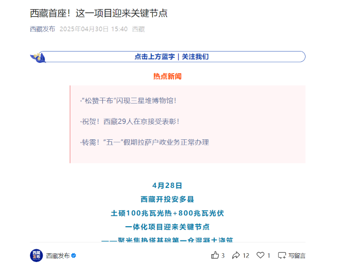 近日,西藏首個(gè)光熱示范工程——西藏開投安多土碩光熱一體化項(xiàng)目建設(shè)迎來關(guān)鍵節(jié)點(diǎn)的消息,被中國發(fā)展網(wǎng)、西藏日?qǐng)?bào)、西藏發(fā)布等各級(jí)媒體平臺(tái)宣傳報(bào)道,提升了集團(tuán)品牌影響力和產(chǎn)業(yè)發(fā)展的傳播力。