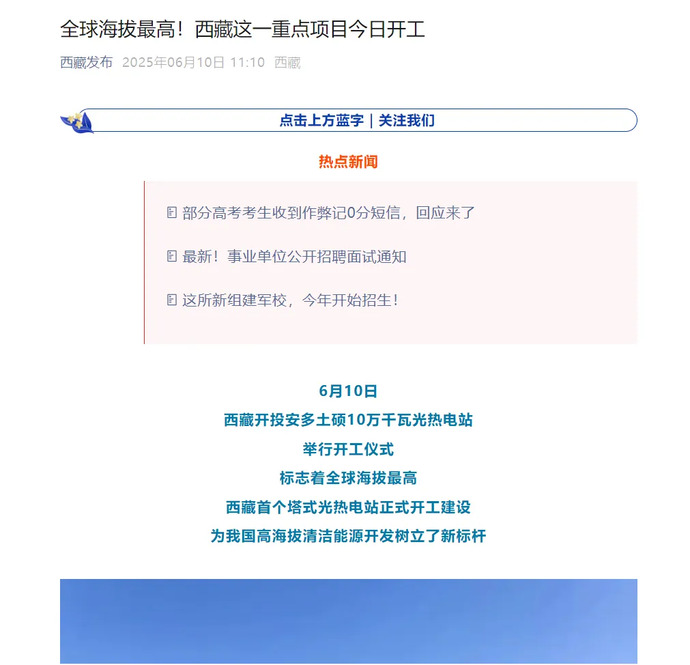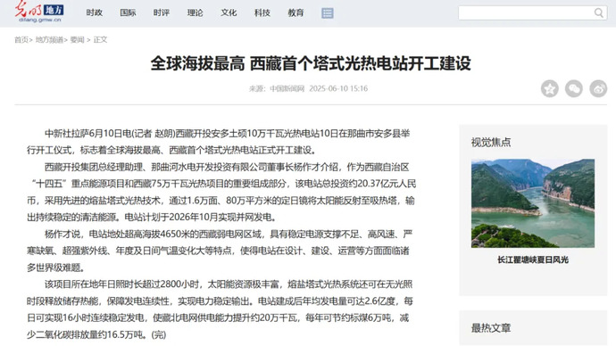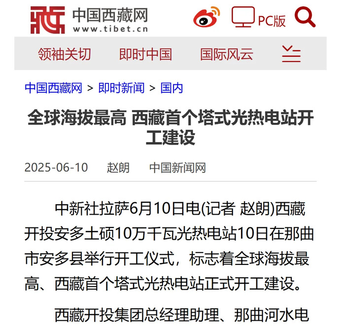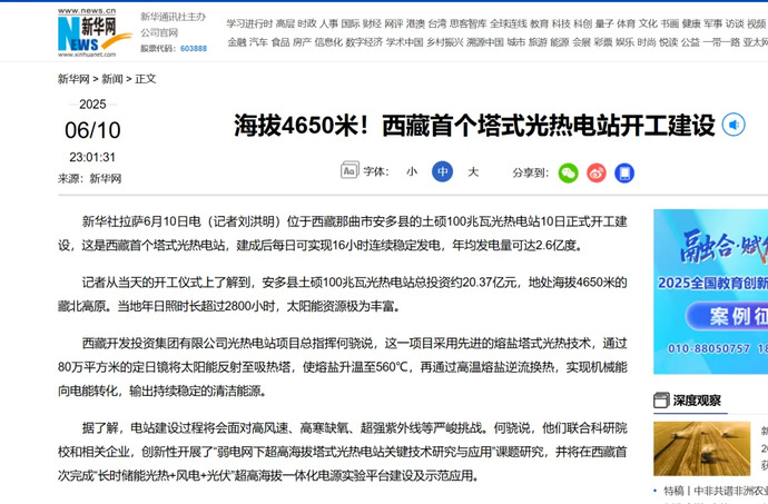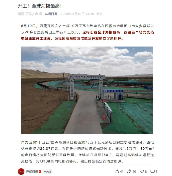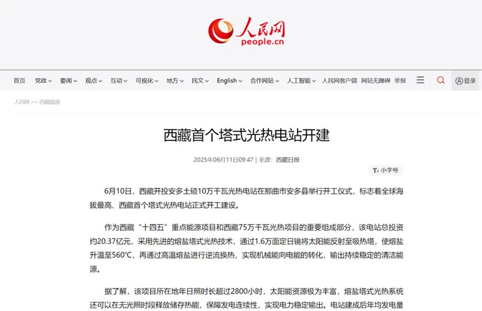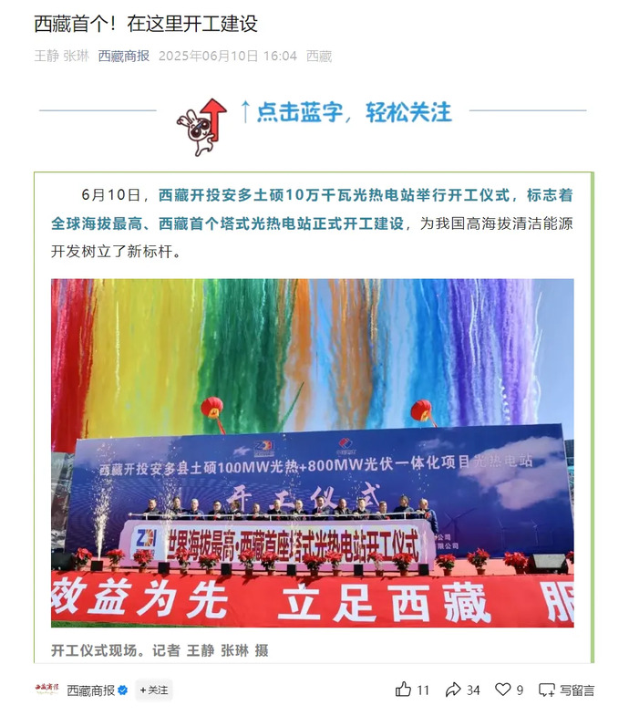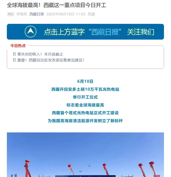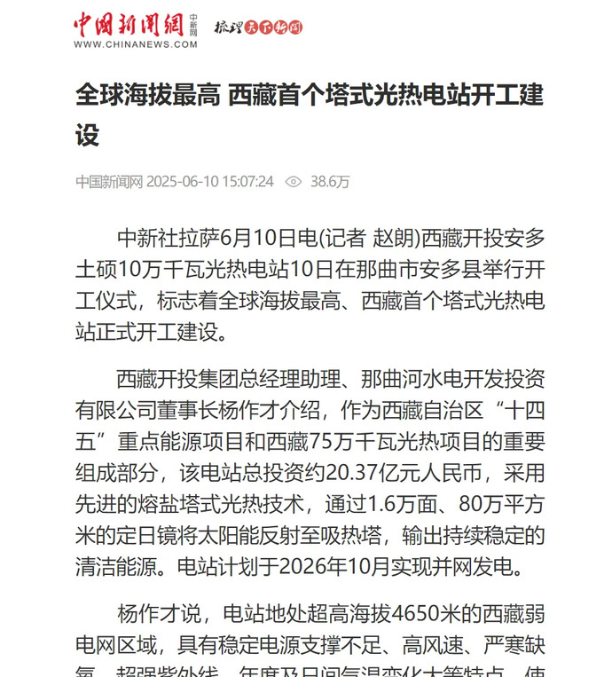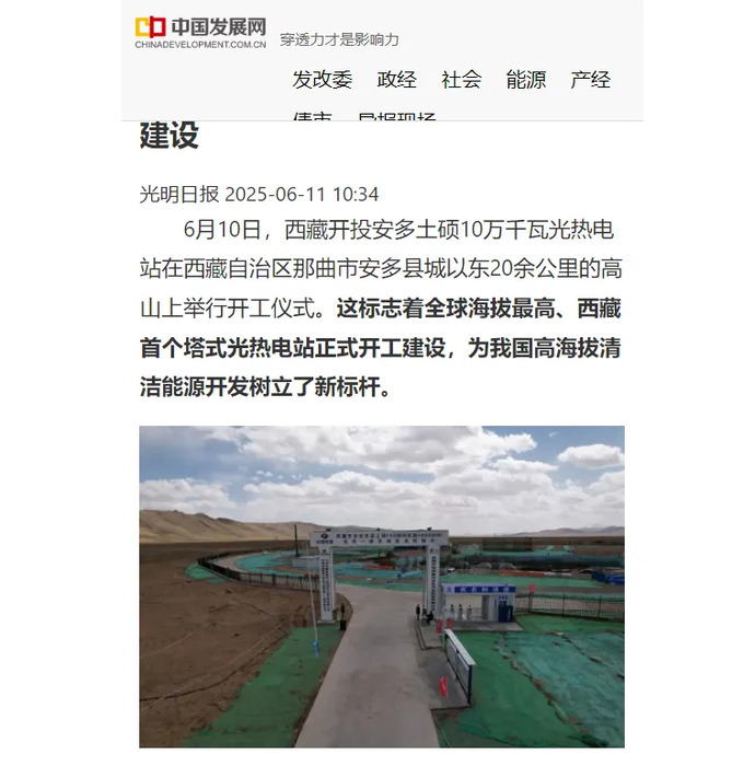 媒體報(bào)道丨全球海拔最高、西藏首個(gè)塔式光熱電站開工建設(shè)