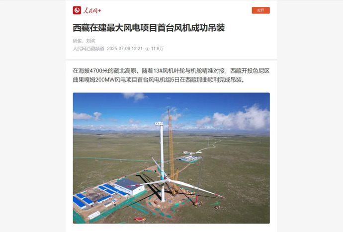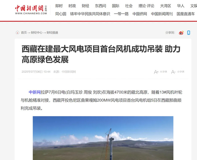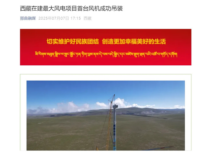 媒體報(bào)道丨西藏在建最大風(fēng)電項(xiàng)目完成首臺風(fēng)力發(fā)電機(jī)組吊裝