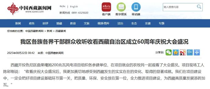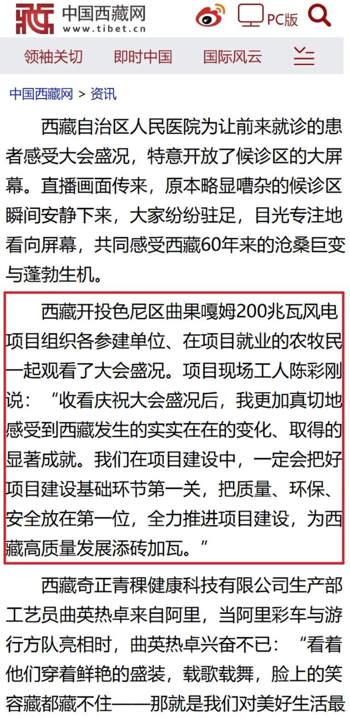 ?。冈?2日,西藏開投色尼區(qū)曲果嘎姆200兆瓦風(fēng)電項(xiàng)目組織各參建單位干部職工、在項(xiàng)目就業(yè)的農(nóng)牧民一起觀看西藏自治區(qū)成立60周年慶祝大會(huì)盛況的消息,被中國西藏網(wǎng)、西藏日報(bào)、中國西藏新聞網(wǎng)、西藏法制報(bào)等各級媒體平臺宣傳報(bào)道。