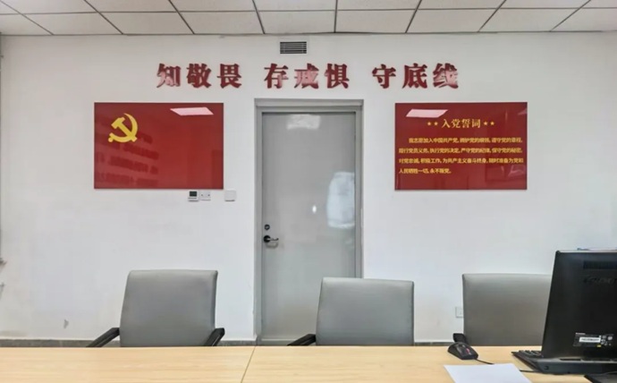“初心談話室”位于集團9樓紀律檢查部。墻體設置有黨旗、入黨誓詞,以及習近平總書記關于加強黨的紀律建設重要論述摘編等內(nèi)容。室內(nèi)還配有專用辦公電腦、打印機、光盤刻錄機等設施設備,實行全封閉管理,嚴格執(zhí)行使用登記制度。