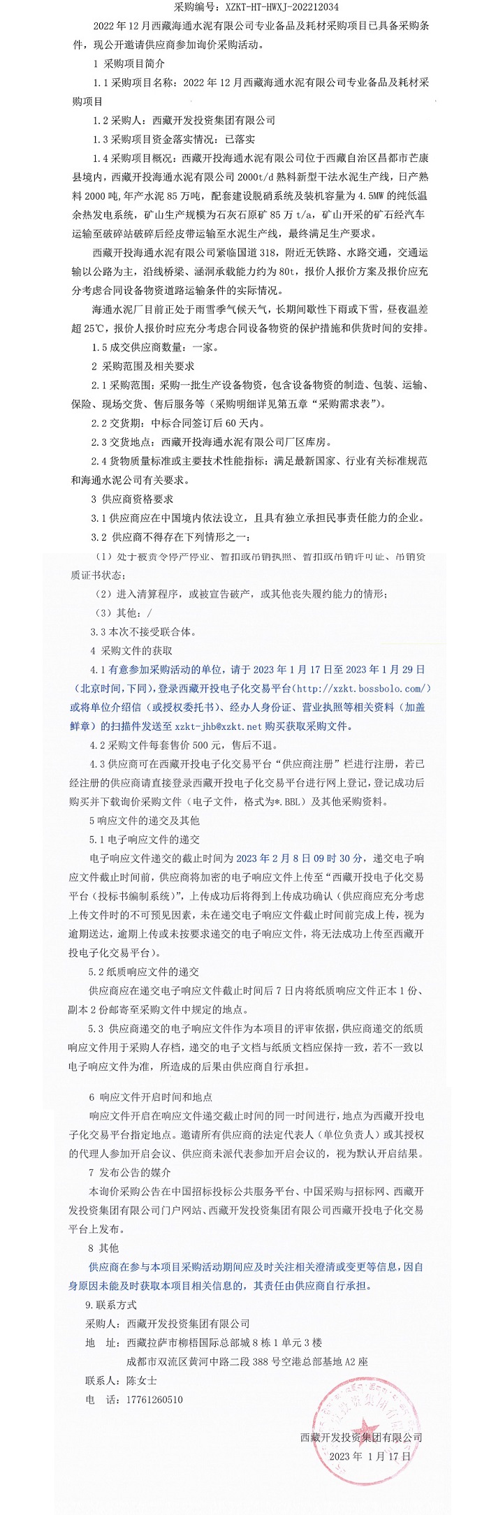 2022年12月西藏海通水泥有限公司專(zhuān)業(yè)備品及耗材采購(gòu)項(xiàng)目詢(xún)價(jià)就采購(gòu)公告