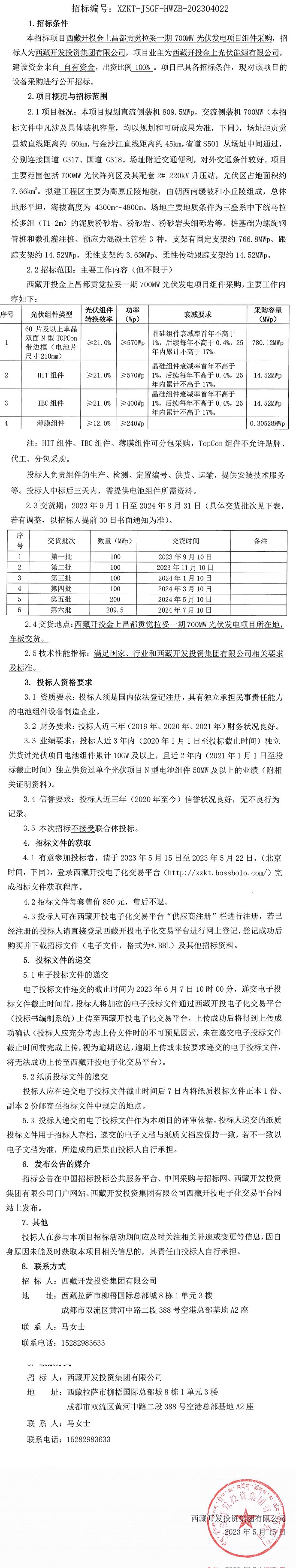 西藏開投金上昌都貢覺拉妥一期700MW光伏發(fā)電項目組件采購招標公告