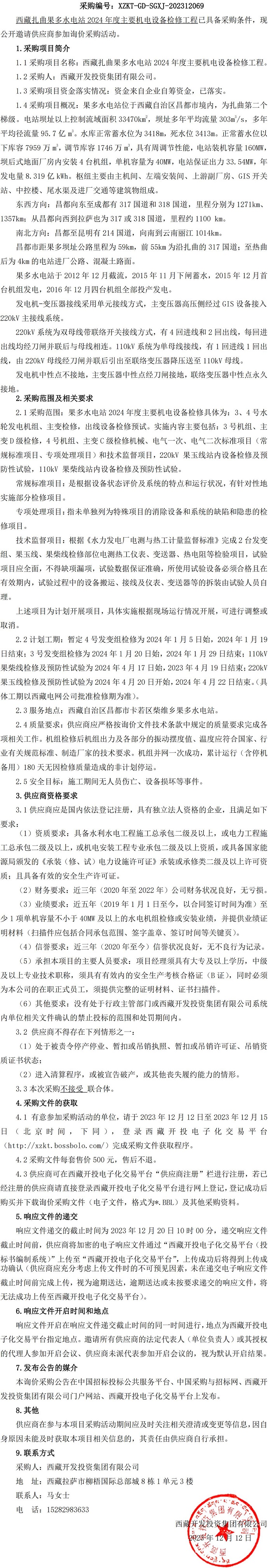 西藏扎曲果多水電站2024年度主要機電設(shè)備檢修工程詢價采購公告