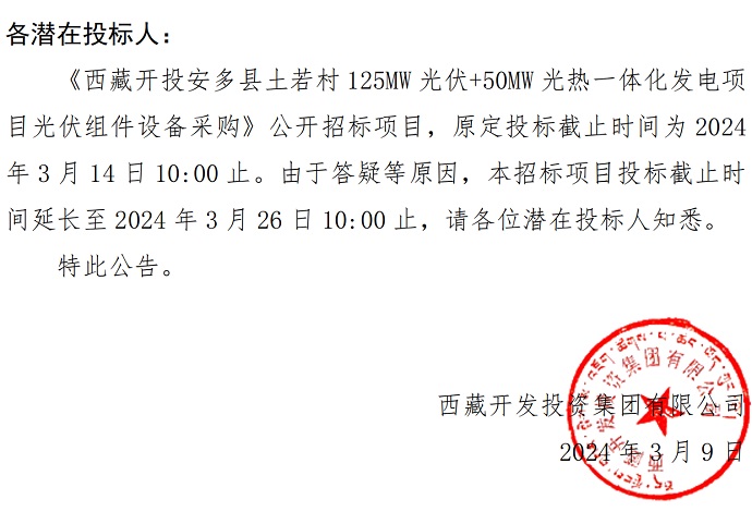 一體化發(fā)電項(xiàng)目光伏組件設(shè)備采購(gòu)》投標(biāo)截止時(shí)間的公告