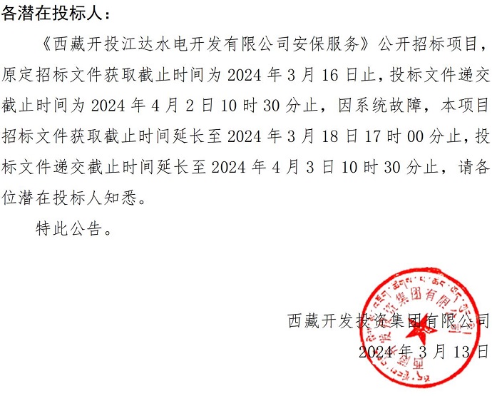 關(guān)于延長(zhǎng)《西藏開(kāi)投江達(dá)水電開(kāi)發(fā)有限公司安保服務(wù)》招標(biāo)文件