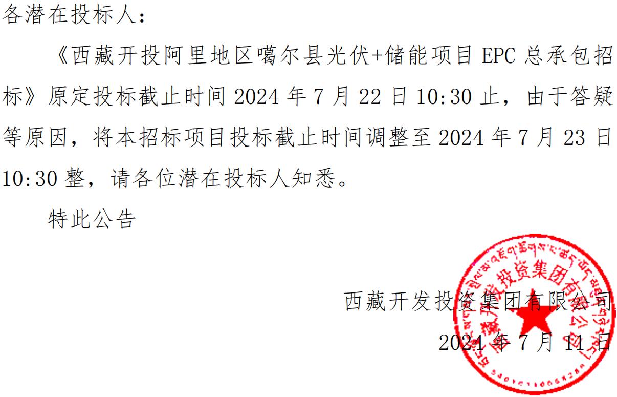 關(guān)于延長《西藏開投阿里地區(qū)噶爾縣光伏+儲 能項目 EPC 總承包招標(biāo)》投標(biāo)截止時間的公告