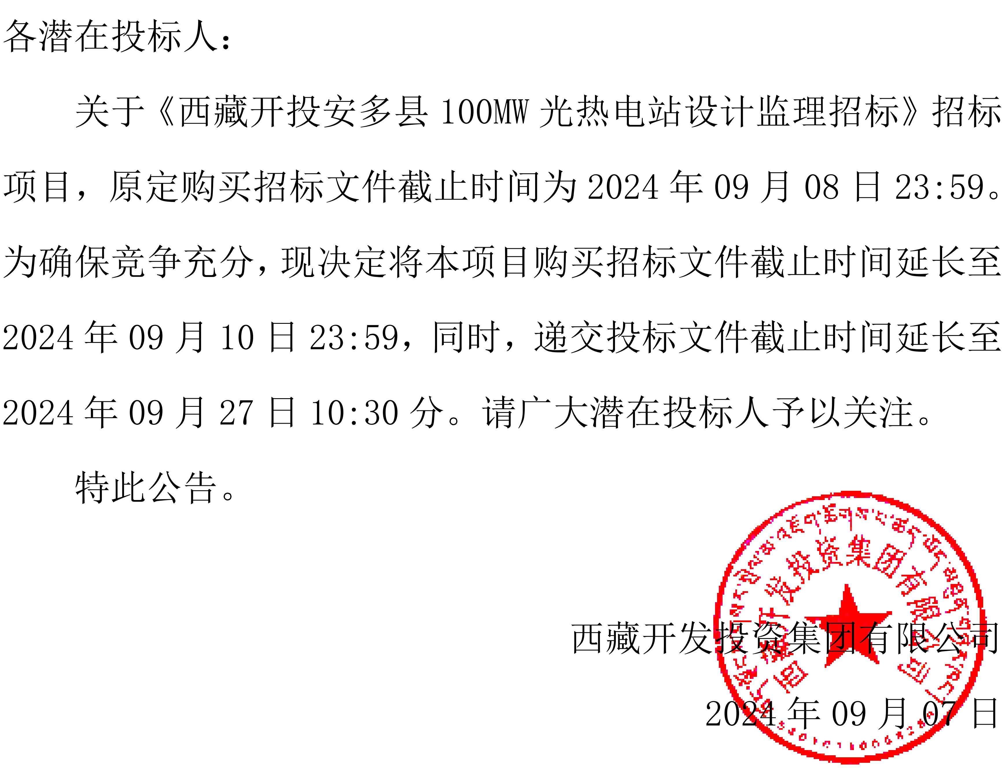 關(guān)于延長(zhǎng)《西藏開(kāi)投安多縣100MW光熱電站設(shè)計(jì)監(jiān)理 招標(biāo)》購(gòu)買招標(biāo)文件截止時(shí)間的公告