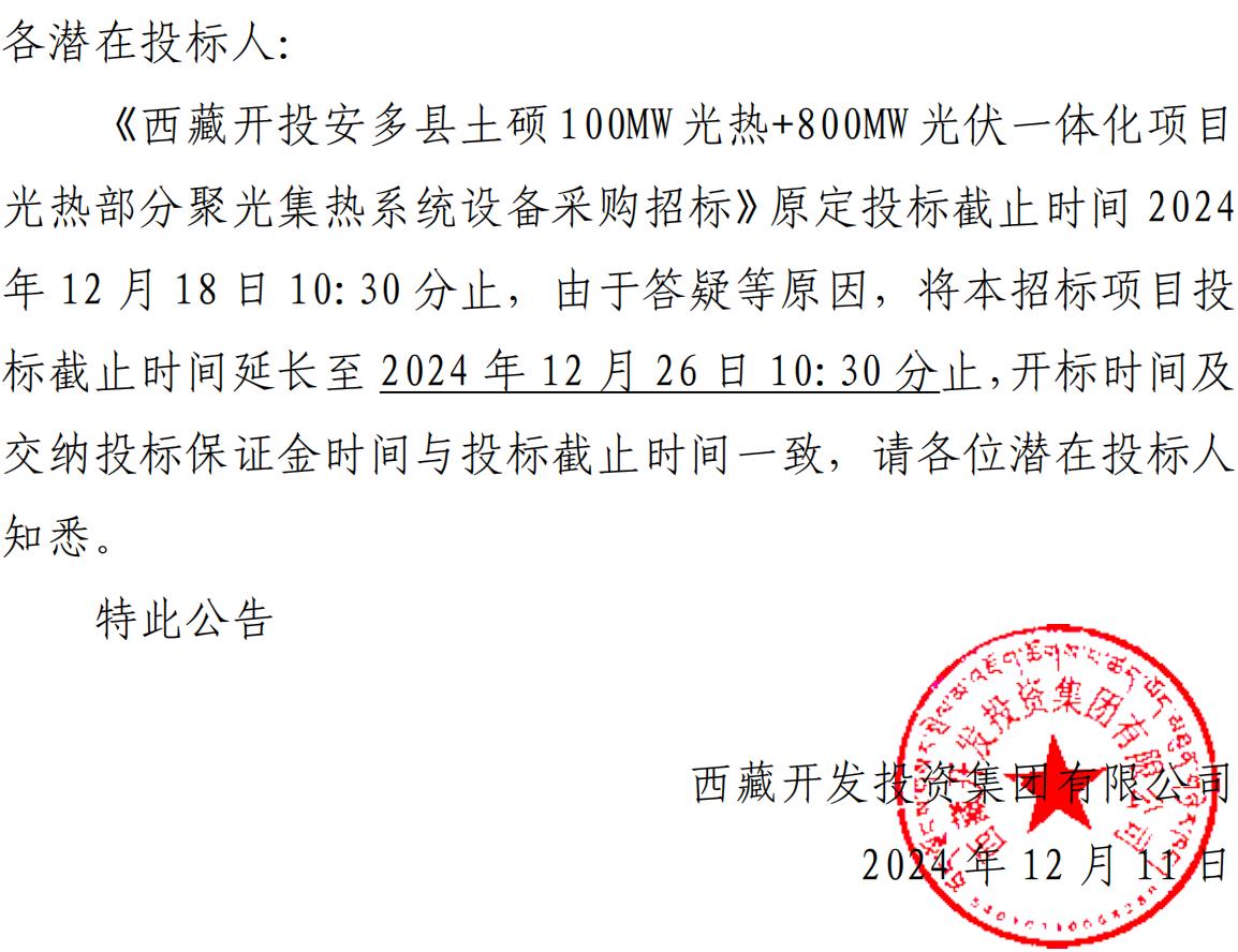 關(guān)于延長(zhǎng)《西藏開(kāi)投安多縣土碩100MW光熱+800MW光伏一體化項(xiàng)目光熱部分聚光集熱系統(tǒng)設(shè)備采購(gòu)招標(biāo)》投標(biāo)截止時(shí)間的公告