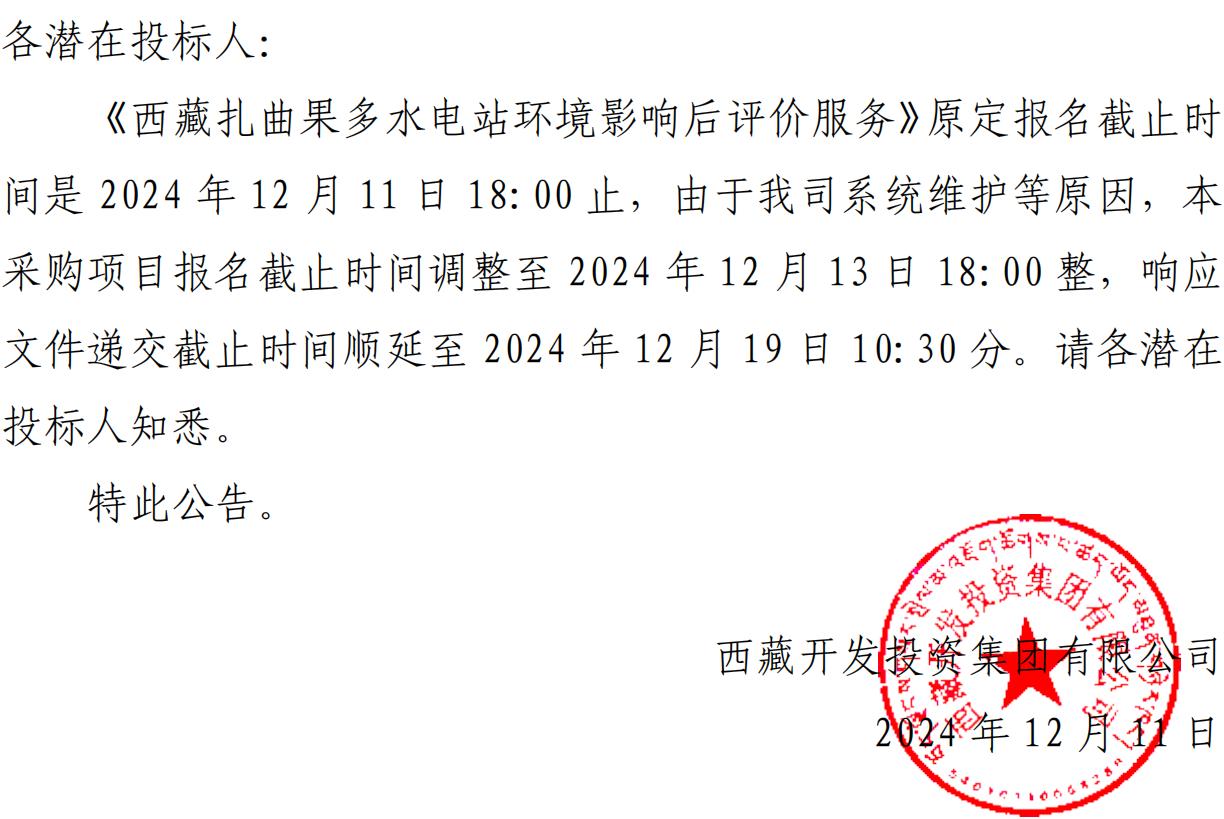 關(guān)于延長(zhǎng)《西藏扎曲果多水電站環(huán)境影響后評(píng)價(jià)服務(wù)》詢價(jià)報(bào)名截止時(shí)間的公告
